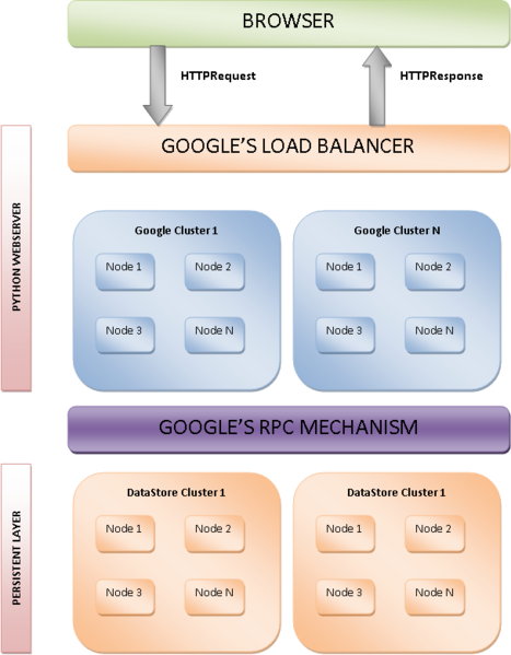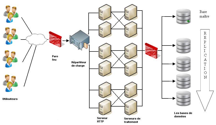 Tous les composants sont doublés (redondés) pour répondre aux problèmes de panne informatique. On ajoute de nombreux serveurs de traitement, on duplique les bases de données, on crée une base de données maitre, et des bases de données filles. On ajoute des serveurs de pages statiques (HTTP), pour soulager les serveurs de traitement. On ajoute des répartiteurs, pour répartir les charges sur les divers serveurs. Ainsi, de suite.