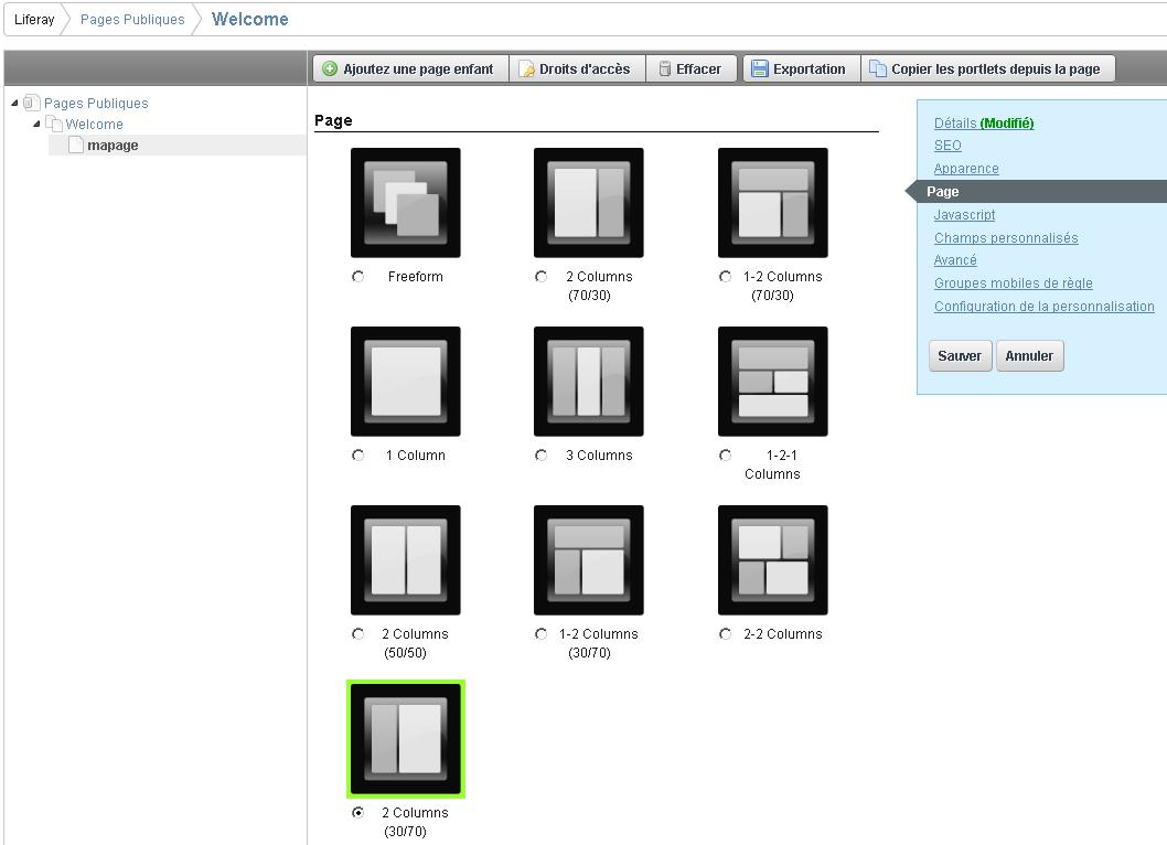 Dans l’image, ci dessus, l’utilisateur choisit le gabarit ( le modèle) de la page web. Il est possible de choisir une pagination pleine page, à 2 colonnes, à plusieurs colonnes. A partir de ce moment, l’utilisateur dépose des articles (portlets) dans les colonnes.