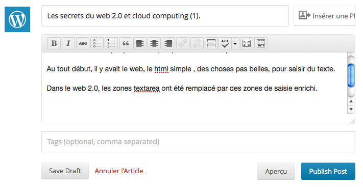 Ci dessus , l’interface minimaliste de saisie d’un article sur le blog. La zone de saisie propose des boutons , des aides à la saisie, de la correction orthographique et ainsi de suite. Elle ne corrige pas toutes les fautes, mais c’est mieux que rien.